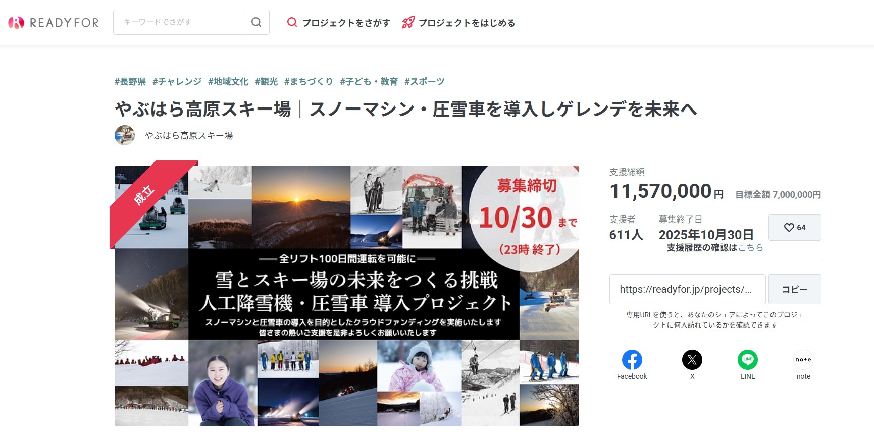 「やぶはら高原スキー場 スノーマシン・圧雪車を導入しゲレンデを未来へ」 目標金額を大きく上回り、無事に終了いたしました。 ご支援いただきました皆さまへ、心の底から感謝申し上げます。 |